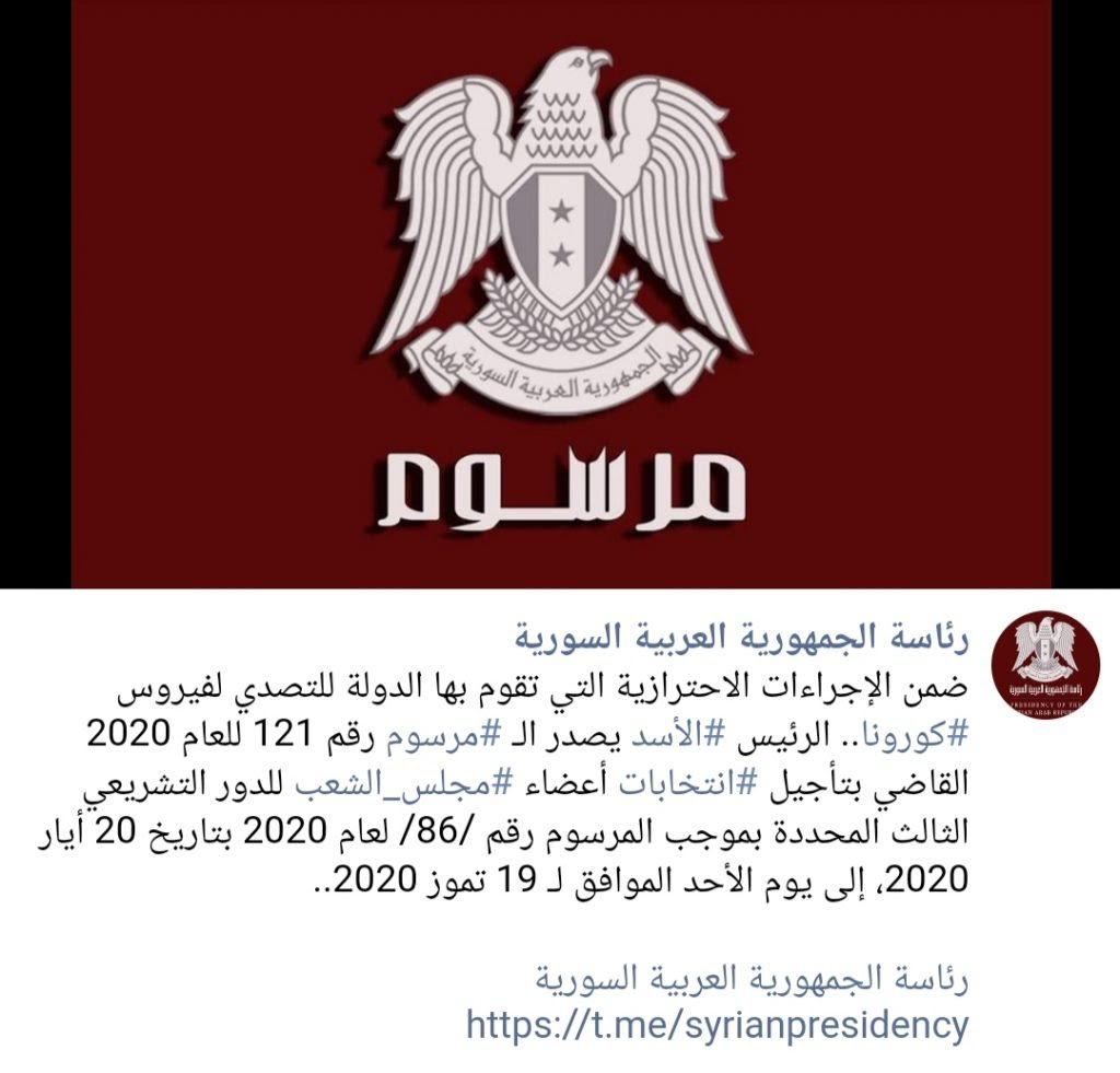 وجاء مضمون المنشور كالآتى”ضمن الإجراءات الاحترازية التي تقوم بها الدولة للتصدي لفيروس كورونا، الرئيس الأسد يصدر المرسوم رقم ١٢١ للعام ٢٠٢٠ القاضي بتأجيل انتخابات أعضاء مجلس الشعب للدور التشريعي الثالث المحددة بموجب المرسوم رقم /٨٦/ لعام ٢٠٢٠ بتاريخ ٢٠ أيار/مايو ٢٠٢٠، إلى يوم الأحد الموافق ١٩ تموز/يوليو ٢٠٢٠”.