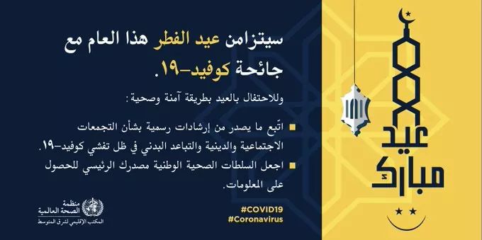 وللاحتفال بعيد الفطر المبارك الذي يأتي هذا العام في ظل تفشي جائحة “كورونا” (كوفيد -١٩)، بطريقة آمنة وصحية، نتمنى اتباع هذه الارشادات والنصائح الصادرة من منظمة الصحة العالمية