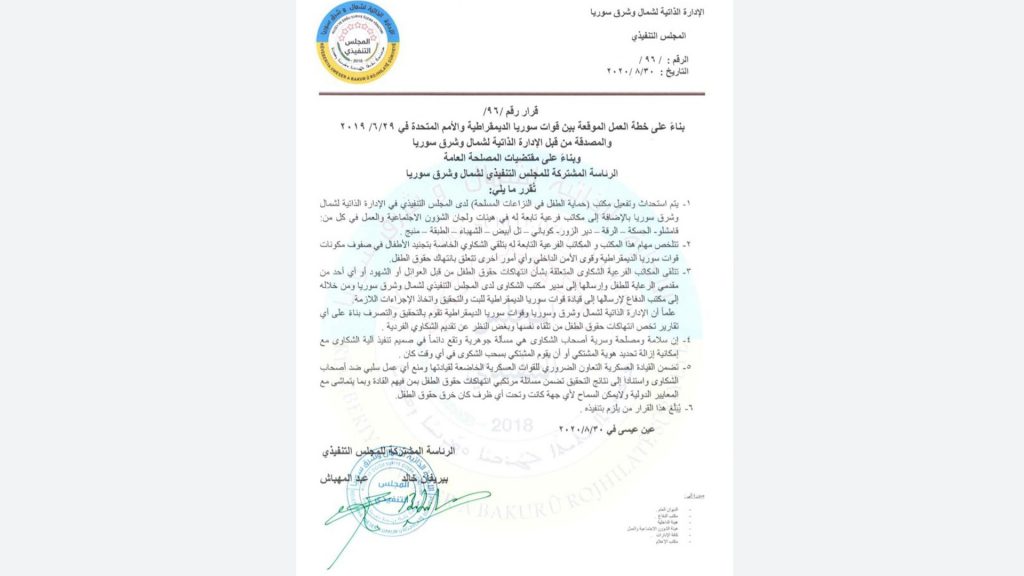 وجاء في بيان أصدره الإدارة الذاتية، أن الإعلان “يستند إلى خطة العمل الموقعة بين قوات سوريا الديمقراطية والأمم المتحدة في ٢٩ حزيران/يوليو ٢٠١٩، والمصدقة من الإدارة الذاتيّة في شمال وشرق سوريا”، وأنها تتعهد “الالتزام والمصادقة على الأعراف والمعايير القانونيّة الدّوليّة السارية، بشأن حقوق وحماية الأطفال المتأثرين بالنزاع المسلح في سوريا”.