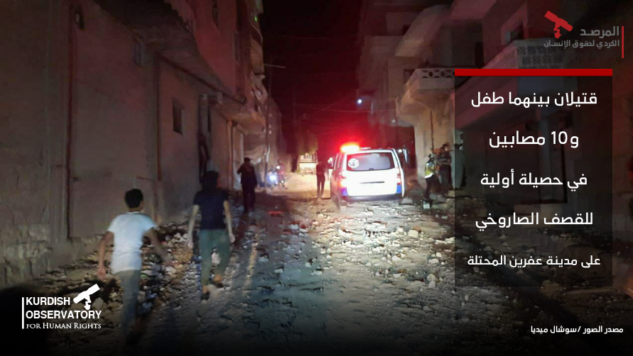 فقد شخصين حياتهما بينهما طفل، وأصيب ١٠ آخرون في حصيلة أولية للقصف الصاروخي الذي تعرضت له مدينة عفرين المحتلة، مساء يوم أمس الخميس ١٥ تموز/يوليو ٢٠٢١.