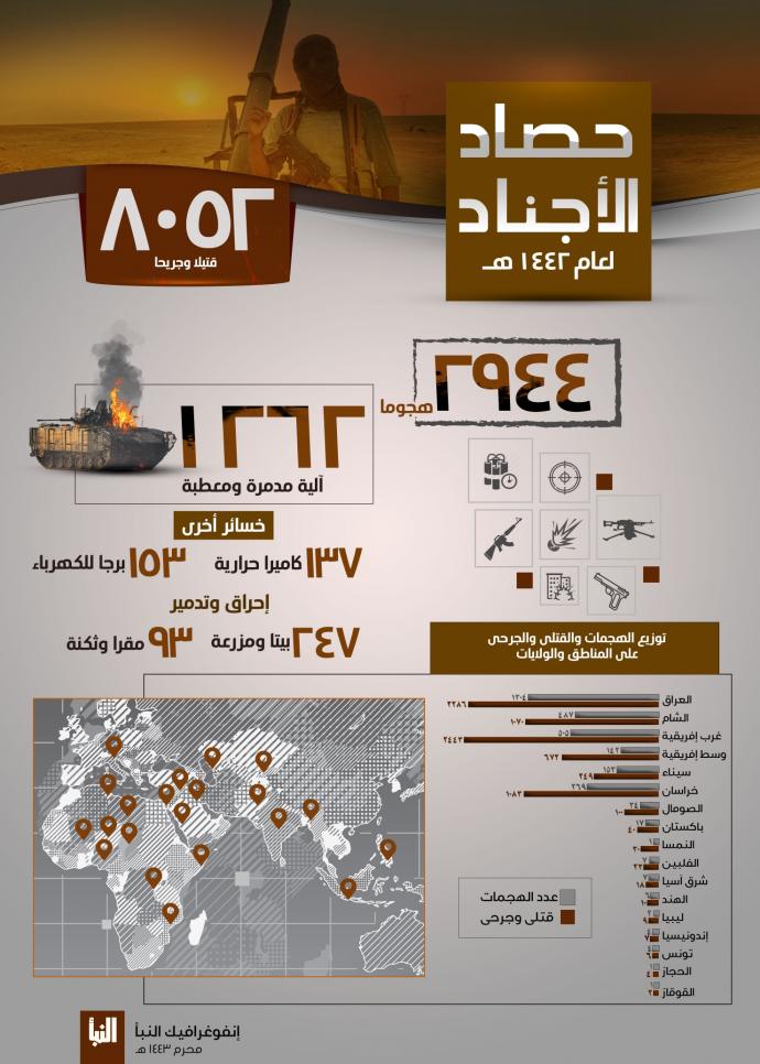 أعلن تنظيم “داعش” الإرهابي مسؤوليته عن ٢٩٤٤ هجوماً في العالم، منها نحو ٥٠٠ هجومٍ في سوريا خلّف أكثر من ألف قتيل وجريح، وذلك خلال العام الهجري الأخير ١٤٤٢.