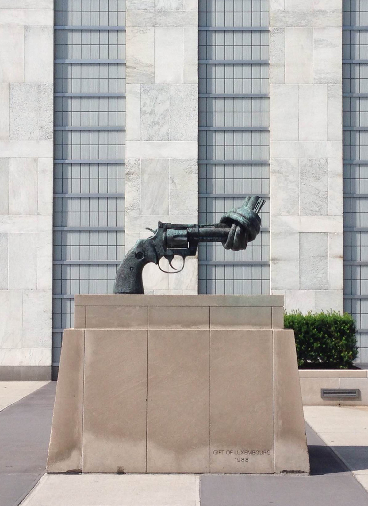 بعنوان “اللا عنف”، يصور هذا النحت البرونزي مسدساً عيار ٤٥ ربطت سبطانته في شكل عقدة. ونفذ الفنان هذا العمل في عام ١٩٨٠ بعد أن سمع بمقتل صديقه، جون لينون. وغضب السيد ريوتيرسوارد وانزعج كثيراً لهذا الموت الذي لا معنى له وأعمال العنف الكثيرة الأخرى التي تجري، فتوجه إلى مرسمه وبدأ العمل على مشروع ” اللا عنف”. ويتألف هذا التمثال البرونزي من نسخة كبيرة لمسدس عيار ٤٥ ربطت سبطانته في شكل عقدة. والمسدس في حالة إطلاق، لكن العقدة تظهر أن النار لن تنطلق منه. ومنذ ذلك الحين، صنعت نسخ مطابقة لهذا التمثال في بلدان عديدة. والتمثال الموجود في الأمم المتحدة هو واحدة من النسخ الثلاث الأولى منه، اشترته حكومة لكسمبرغ وقدمته إلى الأمم المتحدة في عام ١٩٨٨. وقيل آنذاك أنه “مع اللاعنف، فإن كارل فريدريك ريوتيرسوارد لم يهب الأمم المتحدة عملاً فنياً عظيماً فحسب، بل أثرى الضمير الإنساني برمز قوي. وهو رمز يشمل، في منحنيات بسيطة قليلة، أعظم صلاة للإنسان: وهي أنها لا تطلب تحقيق النصر، بل تحقيق السلام”.