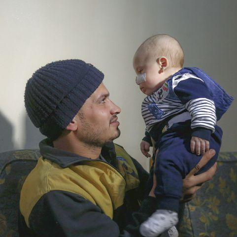 | TOPSHOT - Twenty-seven-year-old member of the White Helmets rescue forces, Saeed al-Masri, holds his three-month-old son Yehya who he rescued after bombardment hit their home the previous week in Saqba in Syria's rebel-held Eastern Ghouta area on February 12, 2018. For years, Samir Salim and his brothers rescued neighbours and relatives pinned underground after bombardment on Syria's rebel-held Eastern Ghouta. But last week, they could not save their own mother. / AFP PHOTO / ABDULMONAM EASSA |