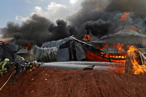 وشاهد مراسل لوكالة “فرانس برس” في المكان حريقاً ضخماً اندلع داخل خزانات الوقود إثر القصف، نتجت عنه سحب ضخمة من الدخان الأسود غطّت أجواء المنطقة.
