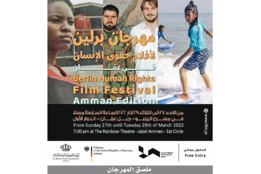 تنطلق عروض أفلام «مهرجان برلين لأفلام حقوق الإنسان في عمّان» مساء اليوم الأحد ٢٧ آذار/مارس ٢٠٢٢، في مسرح الرينبو بجبل عمان. بمشاركة نخبة من الأعمال الحديثة التي تواجه قضايا حقوق الانسان، والتحديات التي تواجهها البشرية في ظلال المعضلات الكبرى كالفقر والبطالة وانتشار المخدرات، اضافة للأثر المدمر الذي تتركه الحروب والنزاعات الطائفية والاثنية.