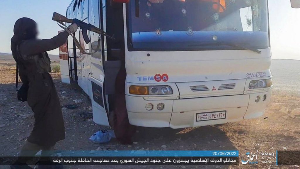 تبنى تنظيم “داعش” الإرهابي، مساء يوم أمس الإثنين ٢٠ حزيران/يونيو ٢٠٢٢، هجوماً استهدف حافلة لقوات “النظام السوري” بريف الرقة، أسفر عن مقتل وإصابة ١٥ عنصراً.