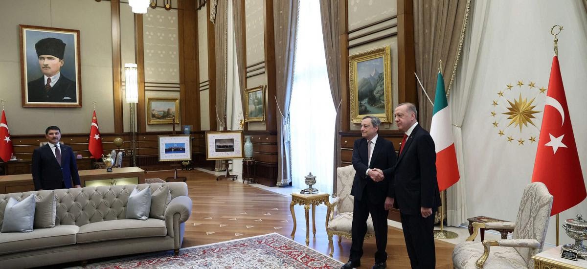 وزار دراغي مع وفد حكومي كبير أنقرة بعد عام واحد من وصفه إردوغان بأنه “ديكتاتور” ما أدى إلى توتر شديد بينهما في خضم نزاع دبلوماسي حول ترتيبات الجلوس خلال اجتماع إردوغان مع رئيسة المفوضية الأوروبية أورسولا فون دير لايين.