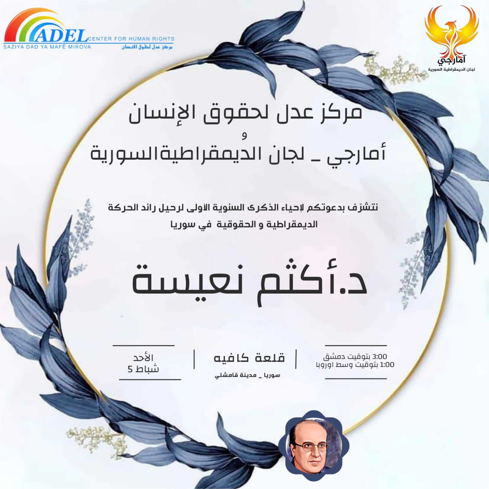 يقام اليوم ٥ شباط/فبراير ٢٠٢٣ الساعة الثالثة مساء في قلعة كافية بمدينة “قامشلو/القامشلي”، بالتعاون بين مركز عدل لحقوق الإنسان وآمارجي – لجان الديمقراطية السورية، فعالية بمناسبة الذكرى السنوية الأولى لرحيل المحامي الدكتور أكثم نعيسة.