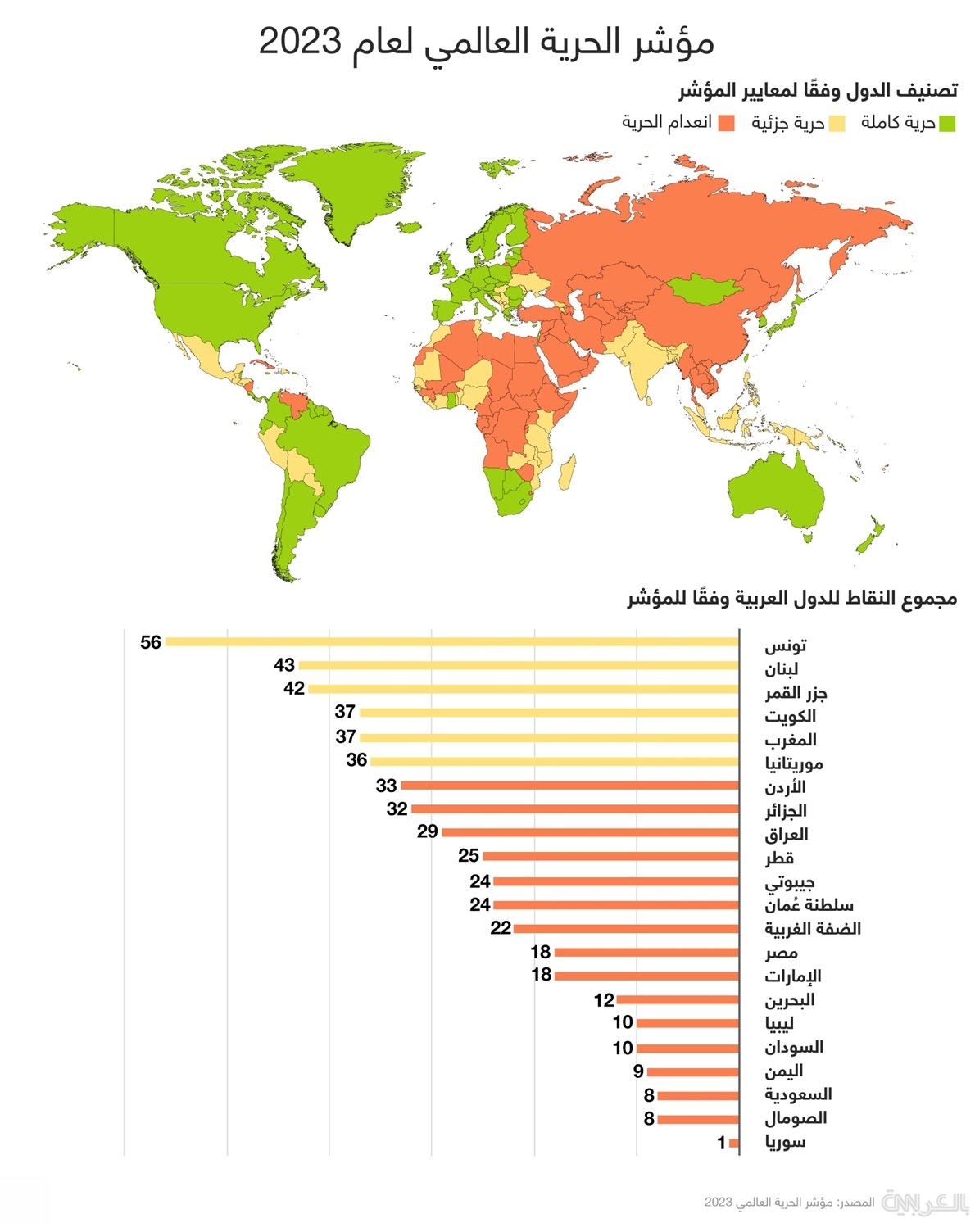 أصدرت منظمة “فريدم هاوس” تقريرها السنوي الذي يكشف مؤشر الحرية العالمي لعام ٢٠٢٣، ويعنى بتقييم درجة الحريات السياسية والحريات المدنية في شتى دول العالم بين كانون الثاني/يناير ٢٠٢٢ حتى نهاية العام.