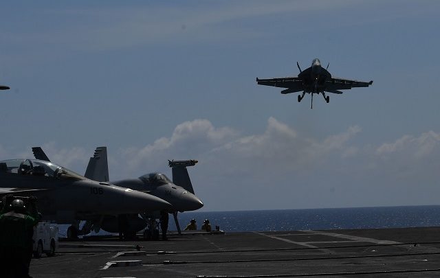 | An FA-18 Hornet fighter jet prepares to land during a routine training aboard the US aircraft carrier Theodore Roosevelt in the South China sea on April 10, 2018. The carrier group Theodore Roosevelt is transiting through the South China sea on its way to the Philippines from Singapore after participating in Operations Inherent Resolve (OIR) and Operation Freedom's Sentinel (OFS) in Syria, Iraq and Afghanistan. / AFP / TED ALJIBE |