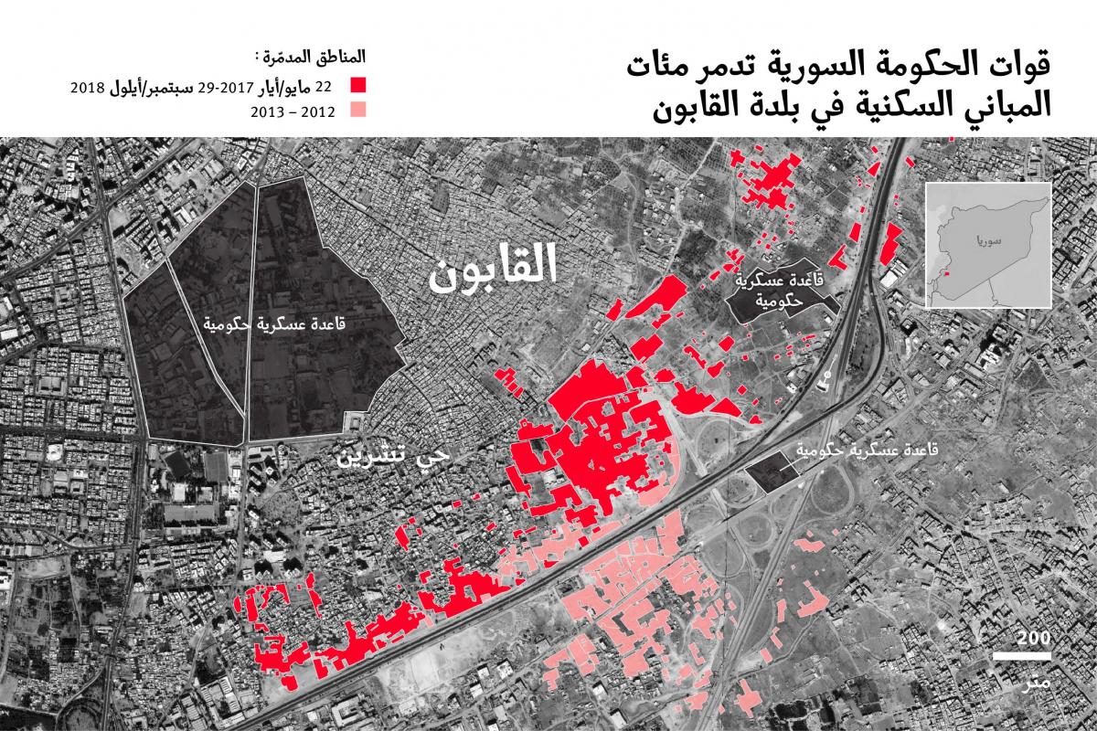 حللت هيومن رايتس ووتش صور أقمار صناعية متسلسلة زمنيا وحددت المئات من المباني السكنية التي هدمت في القابون في الفترة ما بين 22 مايو/أيار 2017 و29 سبتمبر/أيلول 2018. حصلت عمليات الهدم بآلات ثقيلة تتحرك على الأرض مثل الجرافات والحفارات وتفجير المواد شديدة الانفجار. تركزت عمليات الهدم في الطرف الجنوبي من المدينة على طول الأوتوستراد الدولي، على مساحة تزيد على 35 هكتار.
