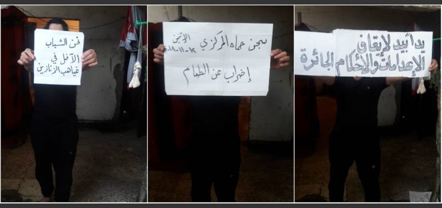 أعلن معتقلون في سجن “حماة المركزي”، يوم أمس الاثنين 12 تشرين الثاني/نوفمبر، عن بدء تنفيذ “إضراب عن الطعام”، وذلك تعبيراً عن مطالبتهم “النظام السوري”، بالإفراج عنهم، كما يأتي بعد صدور قرار بتنفيذ حكم الإعدام لـ ( 11 ) منهم. وفي “مقطع فيديو مسجل” من داخل السجن، أعلن معتقلون عن “بدء الإضراب”، وتلي أحد السجناء “بيانا” مقتضباً طالب فيه بـ “الإفراج” عن معتقلي السجن الذي حبسهم “النظام” منذ بدء الاحتجاجات في سوريا عام 2011. وقال السجين الذي تلي “البيان” إن جهات عدة من “النظام” جاءت إلى السجن وقدمت وعوداً قال إنها “لا تُسمن ولا تغني”، وطالب بالنظر في ملف “المعتقلين” المعلّق منذ سنوات. وفي التسجيل المصور نفسه، ظهر أحد المعتقلين وقال إنه من مدينة “حماة” من الديانة “المسيحية”، كما ظهر سجين آخر من مدينة “القرداحة” مسقط رأس “الأسد”، وطالبا بتسوية “أوضاع السجناء وإصدار عفو عام عنهم”. ويأتي هذا “الإضراب” بعد أيام من حُكم “القضاء العسكري” على ( 11 ) معتقلاً في سجن “حماة” بتنفيذ حكم “إعدامهم”، بعد نقلهم من مكان حبسهم إلى سجن “صيدنايا” – ريف دمشق، والمعروف لدى السوريين بـ “المسلخ البشري”. وصدر الحكم بعد زيارة “القاضي الفرد العسكري”، “فراس دنيا”، للسجن يوم 2 تشرين الثاني/نوفمبر، وطلب نقل الـ ( 11 ) معتقلاً لتنفيذ أحكام “إعدام” بحقهم كانت مؤجلة.