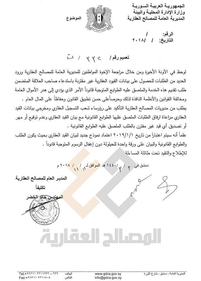 أعلنت المديرية العامة للمصالح العقارية في سوريا، عن اعتماد نموذج جديد لـ “القيد العقاري”، قريبًا. وذكرت المديرية عبر صفحتها في وسائل التواصل الاجتماعي الـ “فيس بوك” أن النموذج الجديد سيتم اعتماده بدءًا من 1 من كانون الثاني/يناير عام 2019، بحيث يكون الطلب والطوابع القانونية، والبيان على ورقة واحدة. وبررت المصالح العقارية اعتماد هذا النموذج بـ “الحيلولة دون إغفال الرسوم المتوجبة قانونًا”، وذلك بعد ورود العديد من الطلبات للحصول على قيود عقارية، غير مقترنة باستدعاء صاحب العلاقة، ومن دون طوابع قانونية، ما يؤدي إلى هدر الأموال العامة، على حد ما جاء في التعميم رقم ( 332 )، الصادر بتاريخ 11 من تشرين الثاني نوفمبر الحالي. وأكدت المصالح العقارية على أمناء السجلات العقارية، ضرورة إرفاق الطلبات المقدمة من أصحاب العلاقة للحصول على إخراج قيد عقاري، مع القيود التي يحصلون عليها، ريثما يتم طرح النموذج الجديد من القيد العقاري، بداية العام المقبل. هذا ويتم تقديم طلب استخراج قيد عقاري إلى ديوان السجل العقاري، ويفترض أن يتم الحصول عليه في اليوم التالي، لكن معظم الطلبات تستغرق أسبوعًا على الأقل، بذريعة أن عدد المالكين كبير، ووجود إشارات دعوى كثيرة، على العقار، ما يدفع الكثير من المراجعين للجوء إلى الموظف مباشرة من دون تقديم طلب نظامي للحصول على قيد عقاري، لقاء مبلغ من المال بهدف الحصول على القيد العقاري في نفس اليوم.