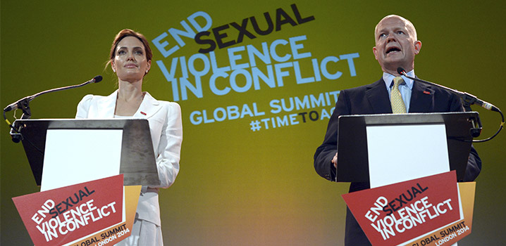 (1) الصورة: الممثلة والمبعوثة الخاصة للمفوضية السامية للأمم المتحدة لشؤون اللاجئين أنجيلينا جولي، ووزير الخارجية البريطاني في ذلك الحين ويليام هيج يتحدثان في قمة عالمية حول إنهاء العنف الجنسي أثناء النزاعات، في لندن (10 يونيو 2014).