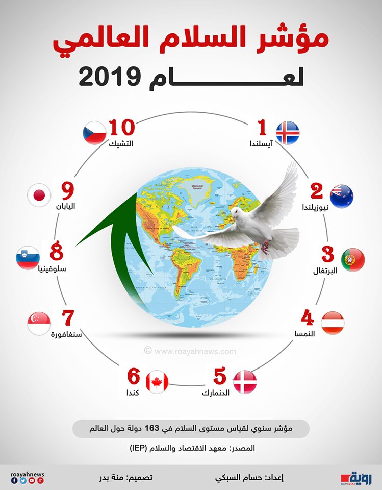 وتصدر قائمة الدول الـ (10) في مؤشر السلام العالمي دول متقدمة هي أيسلندا، نيوزيلندا، البرتغال، استراليا، الدانمارك، كندا، سنغافورا، سلوفينيا، اليابان، التشيك.