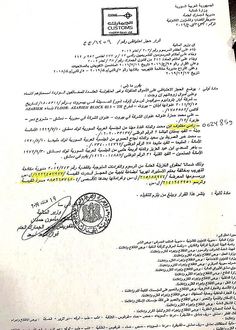 أصدرت الجمارك السورية قرارا بإلقاء الحجز الاحتياطي على أموال رجل الأعمال السوري رامي مخلوف وعدد آخر من رجال الأعمال إضافة إلى زوجاتهم.